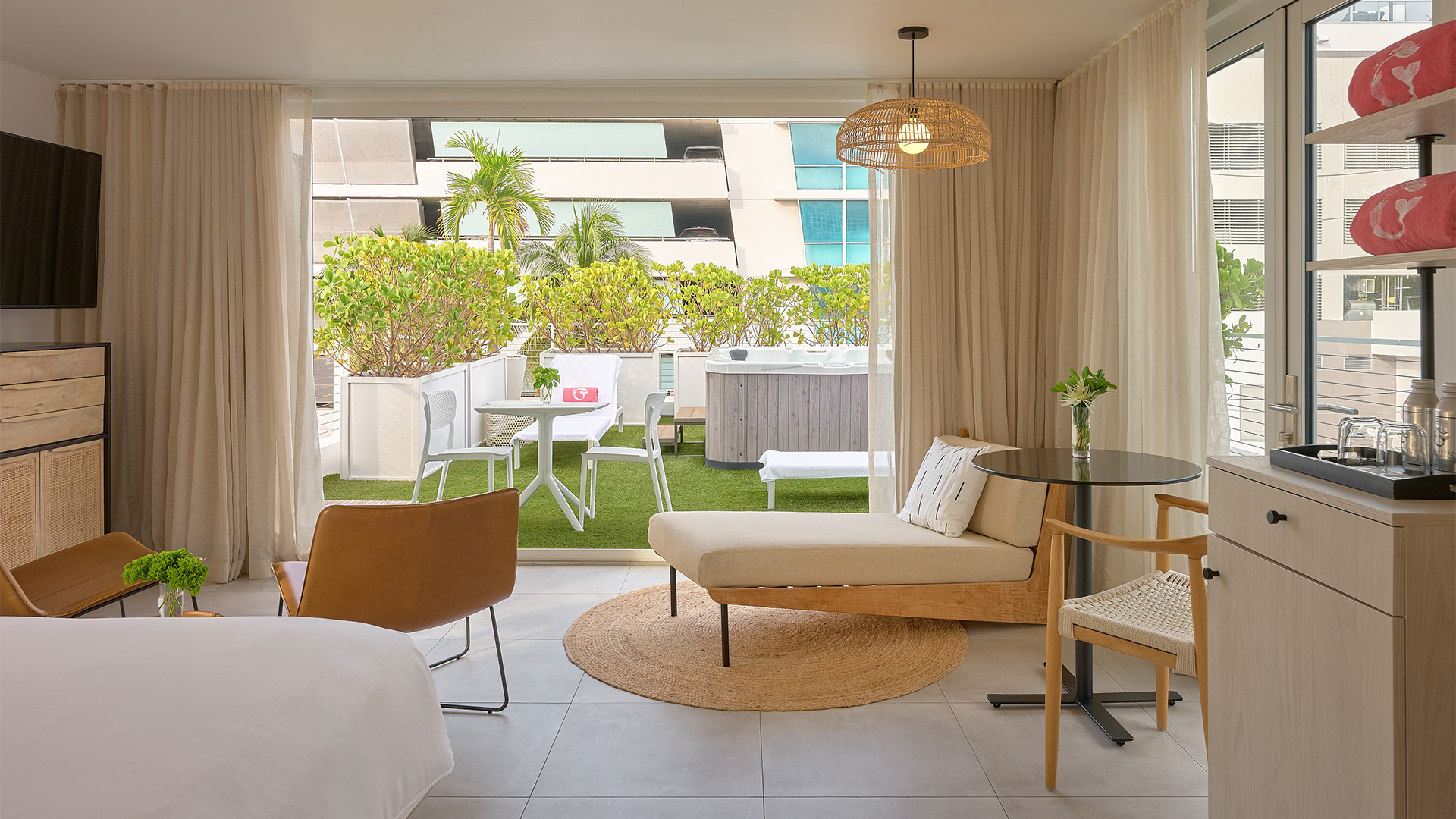 Life in the lap of luxury looks a lot like this—a fully decked out Double Double suite with room for your entire travel crew, featuring a private 348-square foot terrace outfitted with a private jacuzzi and close proximity to Miami’s hottest hangouts.